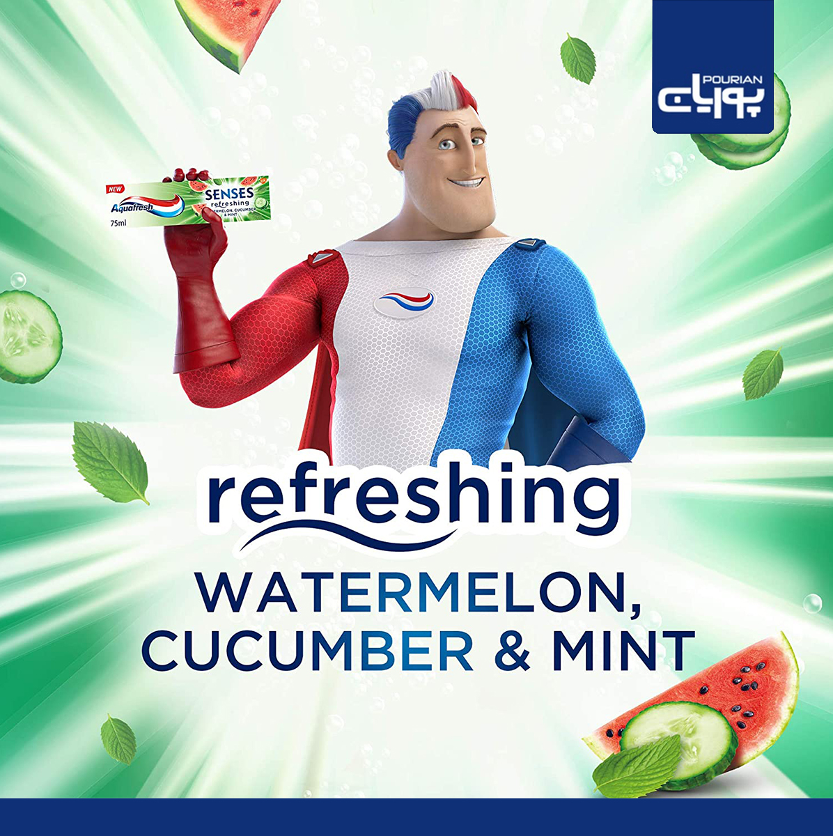 خمیر دندان آکوا فرش سنسیس با ترکیب هندوانه، خیار و نعناع انرژی بخش Aquafresh Senses به سلامت دندانها و لثههای شما کمک می کند و این محصول با طعم های انرژی و طراوت بخش به لذت بردن شما هنگام مسواک زدن کمک میکند ، با مسواک زدن دو بار در روز به سلامت و ایمن دندان ها و لثه خود بیافزایید.