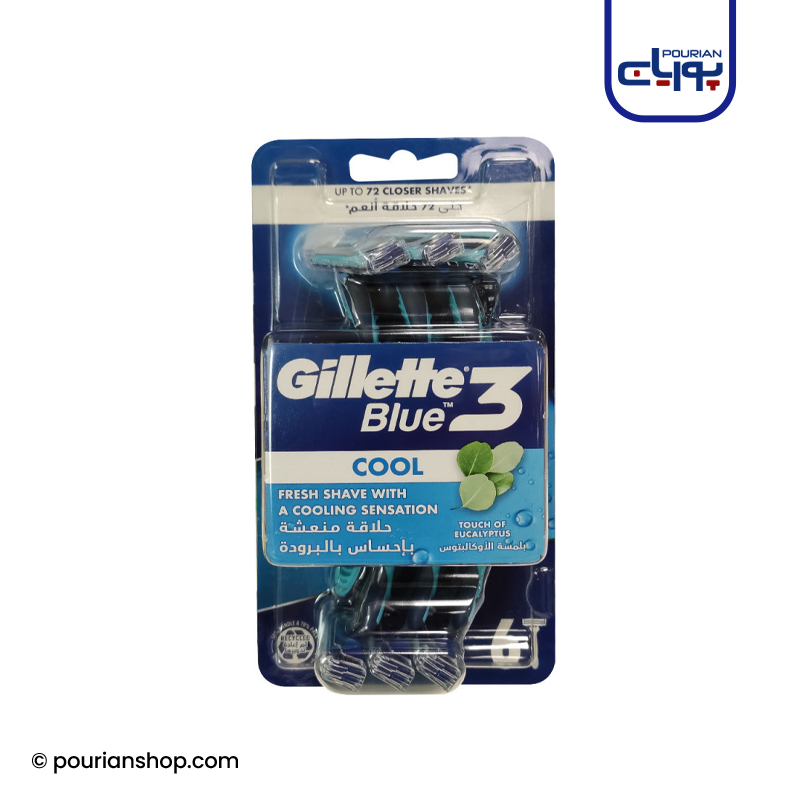 ودتراش ژیلت Gillette سری Blue3 مدل Cool دارای دسته آرگونومیک جهت استفاده آسان دارای نوار صابونی برای اصلاحی روان احساس تازگی و خنک کننده پوست تیغ ۳ لبه برای اصلاحی سریعتر محتوی 6 خودتراش محصول کشور آلمان