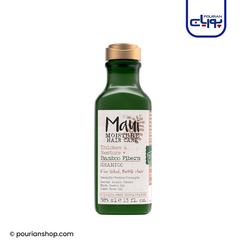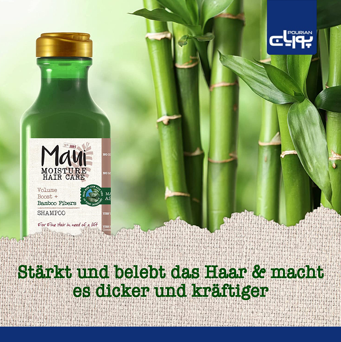 شامپو ضخیم کننده بامبوی مائوئی مویسچر Maui Bamboo Fibers دارای فرمول باکیفیت حاوی فیبر بامبو جهت افزایش ضخامت موهای نازک و شکننده می باشد. شامپو ضخیم کننده و بازسازی کننده مائوئی همچنین حاوی روغن کرچک جهت تغذیه، نرمی و افزایش استحکام مو و روغن دانه چریش (Neem) جهت ترمیم و بازسازی ساختار موهای نازک و آسیب دیده است. این فرمول احیاکننده سرزندگی موها است که به همراه آب آلوئه ورا و آب نارگیل به عنوان پایه اولیه ساخت ترکیب شامپوهای مائوی تامین کننده تمام نیاز تارهای مو برای شادابی و طراوت آن می باشد. شامپو بامبو مائوئی مویسچر فاقد سولفات، سیلیکون، پارابن و گلوتن است و فرمول کاملا گیاهی و وگن دارد.