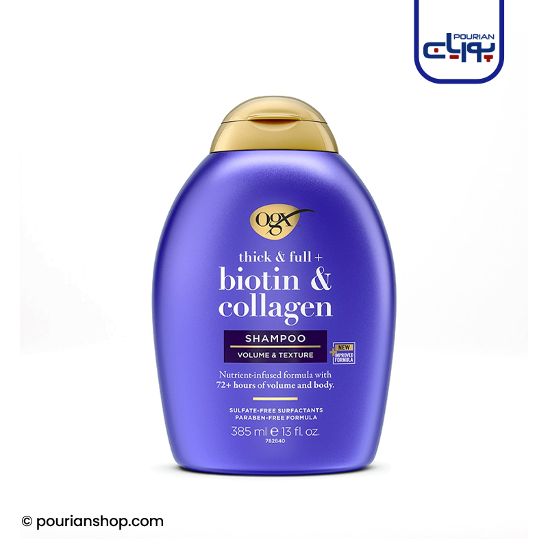 شامپو ضخیم کننده و حجم دهنده بیوتین و کلاژن اوجیکس دارای فرمول انحصاری ویتامین B7 (بیوتین) بهمراه کلاژن و پروتئین گندم هیدرولیز شده جهت رساندن مواد مغذی به هر رشته از موها و ایجاد موهای ضخیم تر، پر حجم تر و سالم تر می باشد. بیوتین به افزایش استحکام مو کمک می کند و کلاژن نیز با تغذیه ساختار مو موجب افزایش حجم مو می شود و در نتیجه موهای سالم و درخشان خواهد بود.
