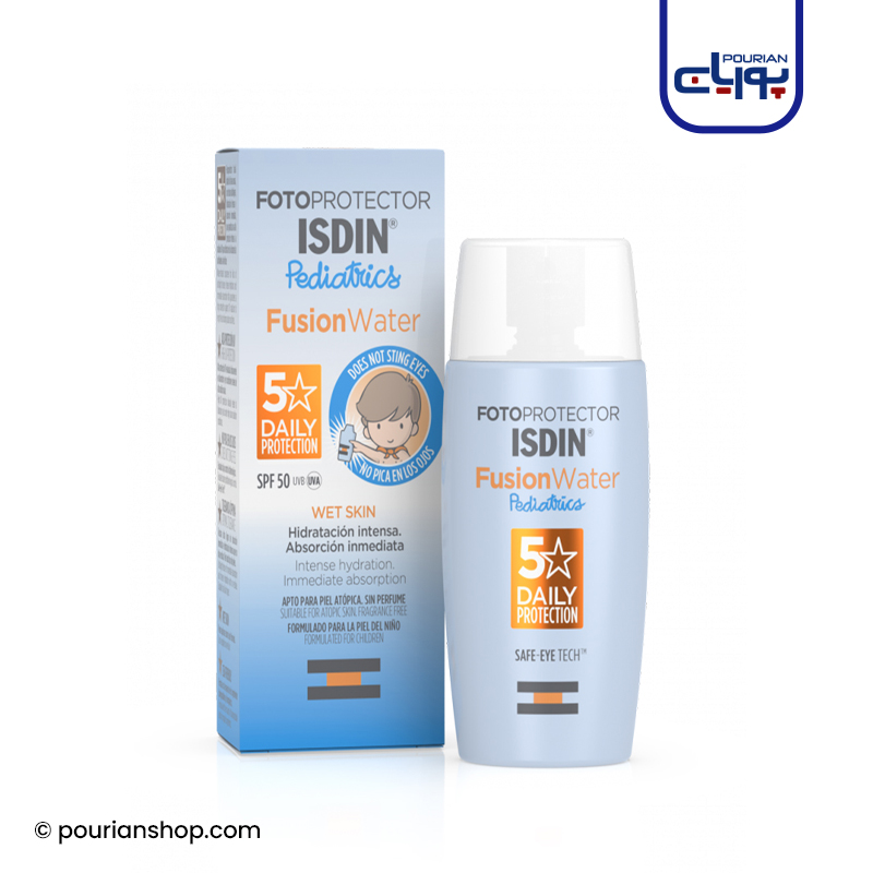 ضدآفتاب فیوژن واتر ایزدین کودکان از طیف ISDIN Fotoprotector مخصوص کودکان بالای پنج سال طراحی شده است. این ضد آفتاب به دلیل داشتن فیلترهای SPF 50+ از پوست نابالغ کودکان در برابر اشعه های خورشید محافظت می کند.این مایع ضد آفتاب دو برابر ضدآفتاب های سنتی در برابر آب مقاوم است تا از محافظت بهینه اطمینان حاصل شود. غنی شده با فیلترهای معدنی، برای انواع پوست کودکان، حتی حساس، ایده آل است. علاوه بر این فرمول آن زیست تخریب پذیر و ضد حساسیت می باشد.این کرم ضد آفتاب برای کودکان دارای بافتی روان و نامرئی بر روی پوست است که به لطف وجود Safe-Eye Tech چشم را خسته نمی کند.
