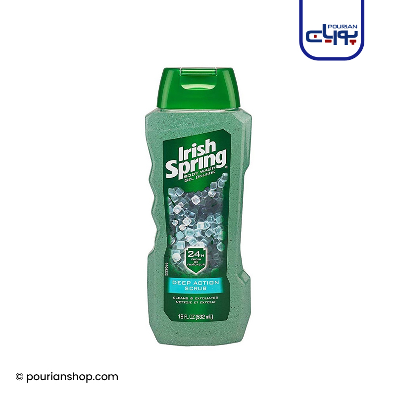 ژل دوش آقایان ایریش اسپرینگ Irish Spring Deep Action Scrub محصولی بسیار باطراوت و نشاط آور بوده و حاوی دانه های نمک صخره های سلتیک به عنوان اسکراب می باشد و علاوه بر حس پرنشاط دارای عملکرد اسکراب و پاک کنندگی کامل است.