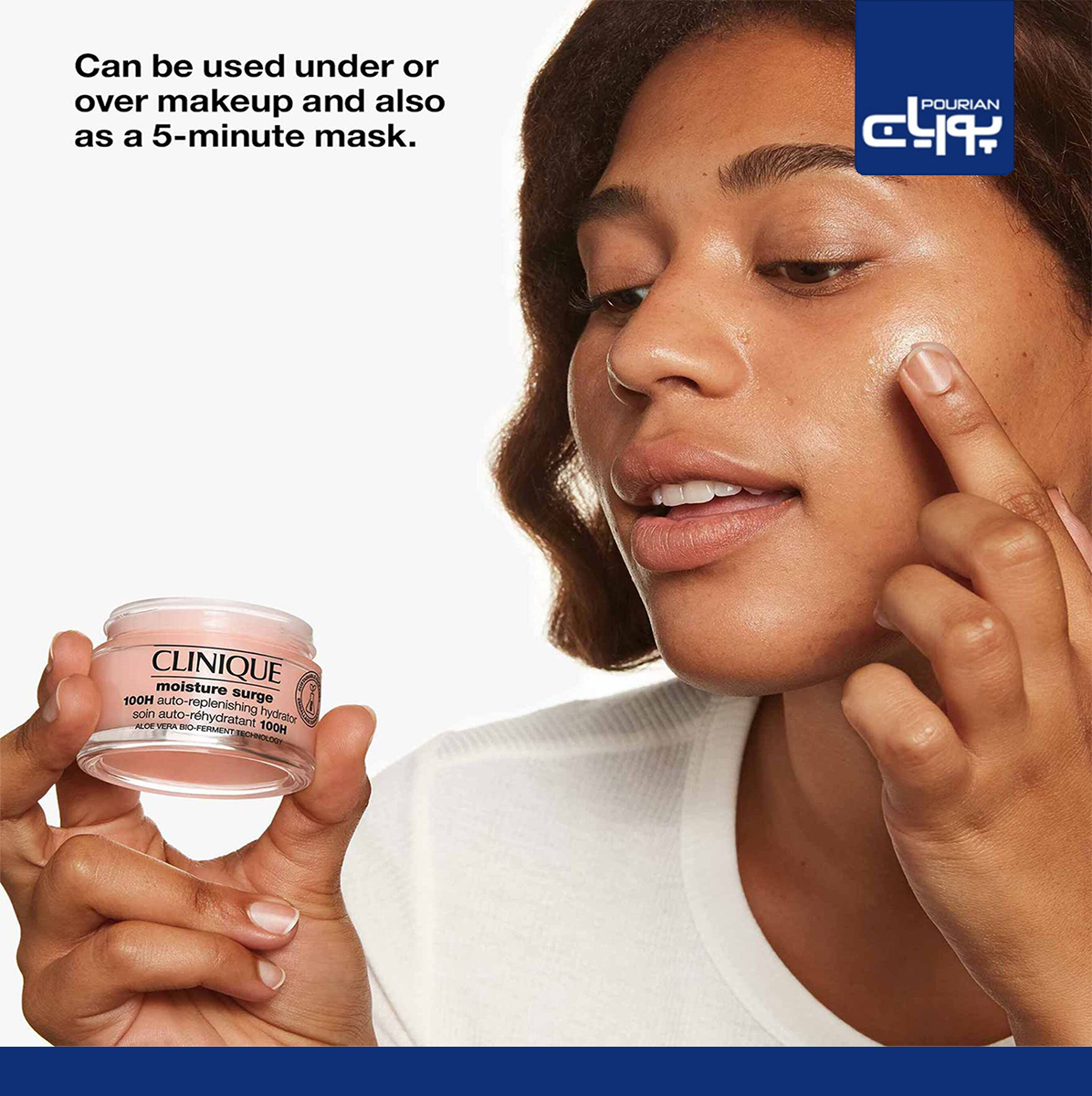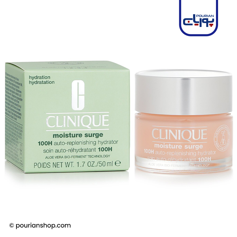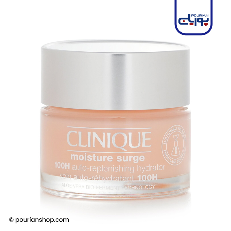 کرم آبرسان کلینیک مدل Moisture Surge 100h در فرمول توسعه یافته خود با تخمیر آلی آلوئه و هیالورونیک اسید ارائه شده است.