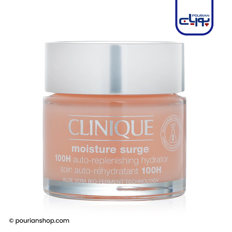 کرم آبرسان کلینیک مدل Moisture Surge 100h در فرمول توسعه یافته خود با تخمیر آلی آلوئه و هیالورونیک اسید ارائه شده است.